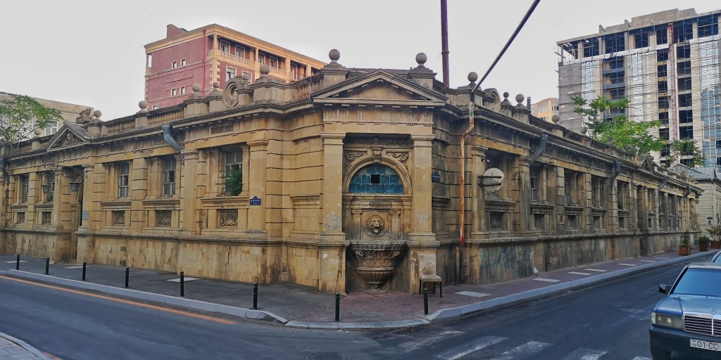View of Fantasy Bath House Three blocks further up to the north, there stands famed 120-year old Fantasy Bath House. However, the owner has never been identified and it was a design project by Nicholas von der Nonne, one of the prominent architects of Baku. Newspapers of the time covered the opening of the bathhouse in 1897 lengthily commenting on lavish interior design, electric lighting of in and around the building, telephone lines, imported freshwater and relatively cheap services. Baku suffered from the scarcity of freshwater and the absence of a centralized sewage system and bathhouses had an important role in the city’s life. It was not just a place where people took bath but also engage in socialising, such as making deals, catching up with friends or mothers’ searching for a bride for their sons. Thus, going to a bathhouse was a special weekly occasion in everyday people’s life. Nonetheless, all fame is gone with winds, today the bathhouse stands as dormant.